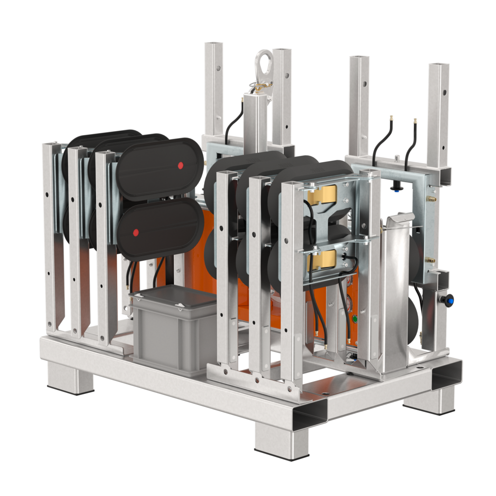 VIAVAC GBXL jest dostępny z ramą transportową, umożliwiającą przechowywanie i transport podnośnika do szkła bez ryzyka uszkodzenia. Jednostka główna podnośnika, wraz ze wszystkimi częściami zamiennymi, może zostać umieszczona na ramie. Rama transportowa wyposażona jest w wycięcia, co ułatwia jej podnoszenie za pomocą wózka widłowego. Wymiary ramy transportowej to 1 200 × 1 000 mm.